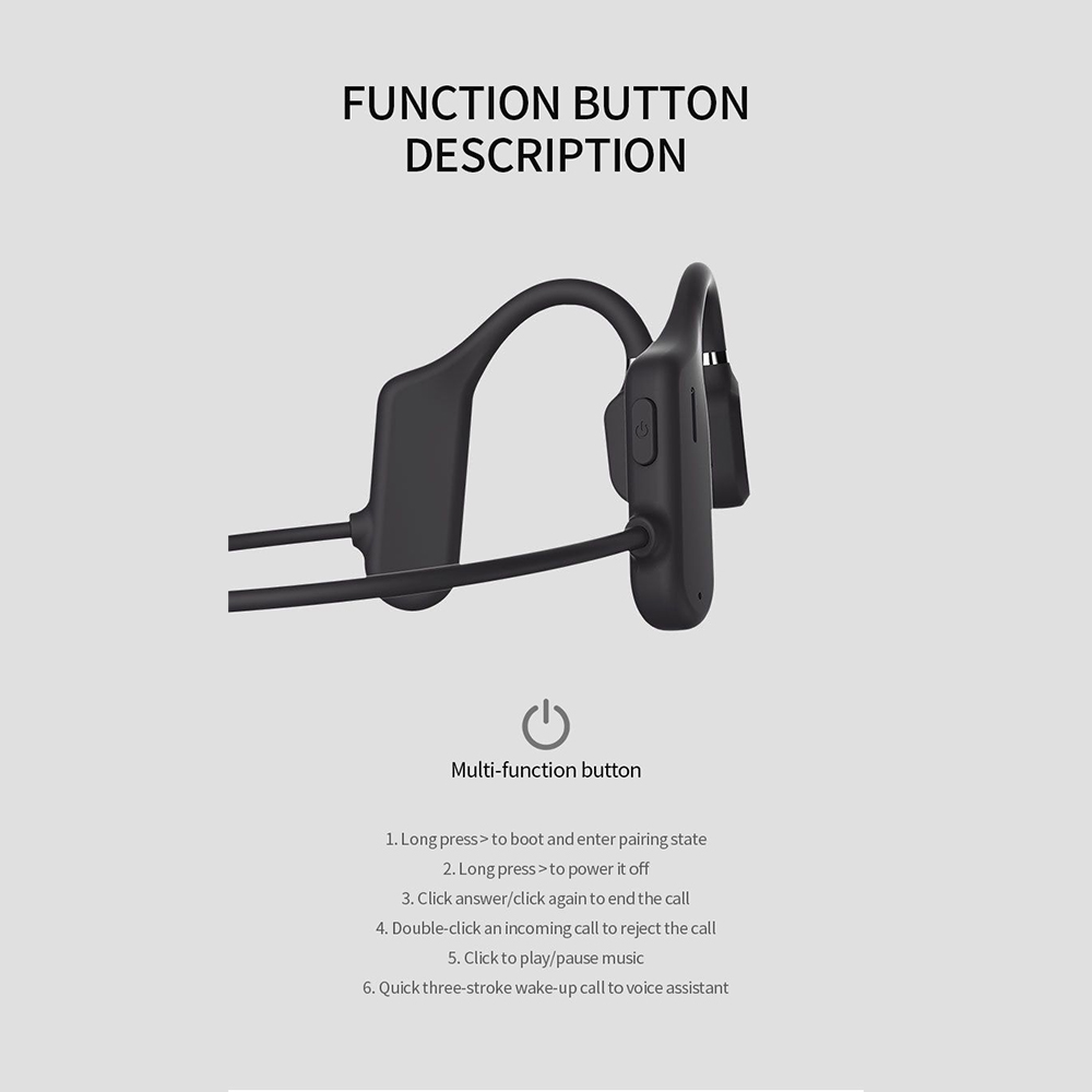 Bone conduction headphones are the perfect choice for those who want to listen to music or take calls on the go without sacrificing their ability to hear their surroundings. Unlike traditional headphones that cover the ear, bone conduction headphones use vibrations to transmit sound through the bones of the skull, leaving the ears open to ambient noise. This makes them ideal for use while running, biking, or doing other outdoor activities, as well as for people who work in noisy environments. With features such as wireless connectivity, touch controls, and water resistance, these headphones offer a convenient and high-quality listening experience. Upgrade your audio game with the innovation of Bone conduction headphones today. Specifications: Product Dimensions: 5.7 x 4.3 x 1.5 inches Product Weight: 1.02 ounces Battery: 120mAh Frequency: 20Hz-20kHz