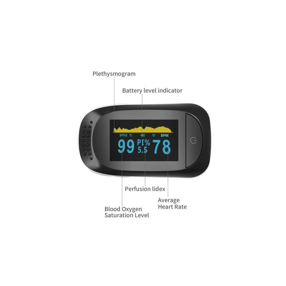 Our Oximeter is a compact and easy-to-use device that measures your blood oxygen saturation (SpO2) levels and pulse rate in just a few seconds. Our oximeter is a non-invasive, painless and easy way to check on your oxygen levels, especially useful for people with chronic respiratory conditions such as COPD, Asthma, or smokers, or people who engage in high-intensity physical activities. The oximeter is also useful for monitoring the oxygen levels of elderly individuals or anyone who may be at risk of hypoxia while on the go. It is easy to read with a digital display and is battery-powered, without need for an external power source. Order yours today to help take control of your health and have confidence knowing that you can monitor your oxygen levels whenever you need to. Features: plethysmogram, battery level indicator, perfusion index, blood oxygen saturation, and average heart rate. Specifications Product Dimensions: 1.97 x 1.97 x 0.79 inches Product Weight: 3.21 oz.